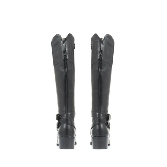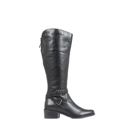 This season’s ultimate riding boot, crafted in Europe with smooth polished leather and styled with a timeless knee high silhouette teaming effortlessly with dresses and jeans alike, fitted with buckle saddle detailing and wide fitting, adjustable calf.